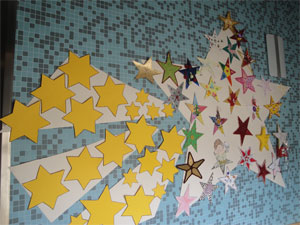 Uma estrela feita de estrelas – Na valência de creche o desafio foi outro: cada família foi convidada a ajudar a criança a enfeitar uma estrela. Todas as estrelas foram colocadas numa estrela maior, na portaria, a qual ilumina com os seus raios o caminho dos magos até ao presépio. Foi outro significativo gesto de envolvimento familiar.